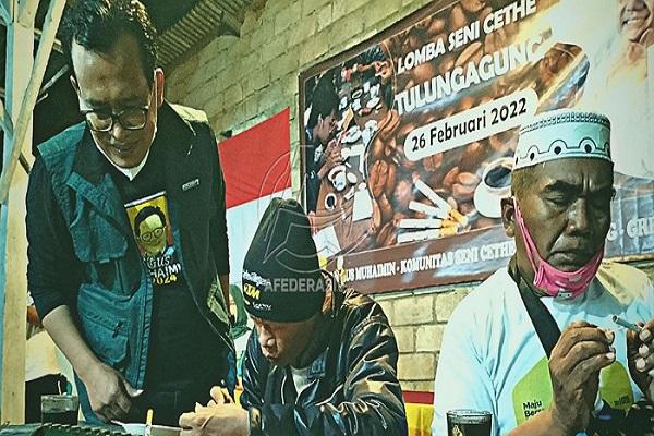 Tulungagung, Indonesiainfo.id - Relawan Gus Mahaimin Iskandar for Presiden RI 2024 menggelar lomba Cethe atau mengoleskan ampas kopi ke batang rokok di warkop Green Coffee Jalan Mayor Sujadi Timur Desa Plosokandang, Kecamatan Kedungwaru, Sabtu malam (26/2/2022).