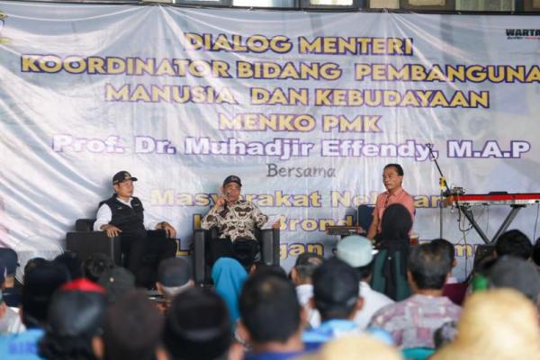 Menteri Koordinator Bidang Pembangunan Manusia dan Kebudayaan (Menko PMK) Muhadjir Effendy dialog dengan para nelayan dalam penutupan kegiatan Petik Laut di Kecamatan Brondong, Kabupaten Lamongan, Jawa Timur, pada Jumat (12/1/24). (Foto: Kemenko PMK)