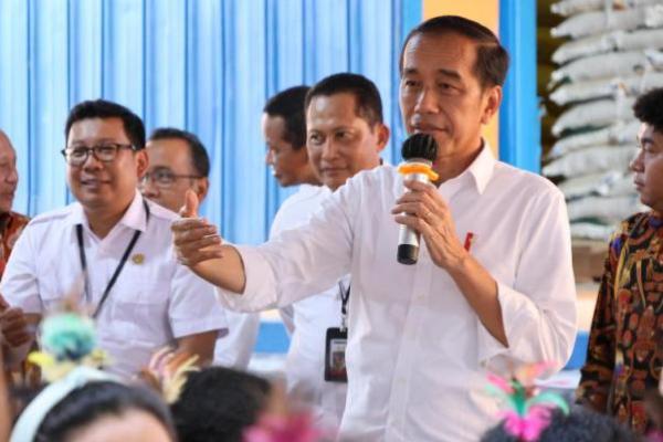 Presiden Joko Widodo didampingi Kepala Badan Pangan Nasional/National Food Agency (NFA) Arief Prasetyo Adi menyaksikan penyaluran bantuan pangan beras di Biak Numfor, Papua, Rabu (22/11/2023).