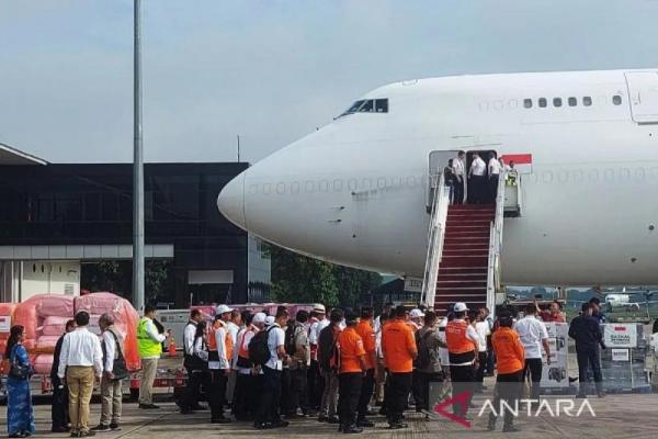 Menteri Luar Negeri Sugiono beserta rombongan saat mengecek kesiapan logistik bantuan kemanusiaan yang akan dikirim ke Myanmar di Lanud Halim Perdanakusuma Jakarta, Kamis (Foto: Antara)