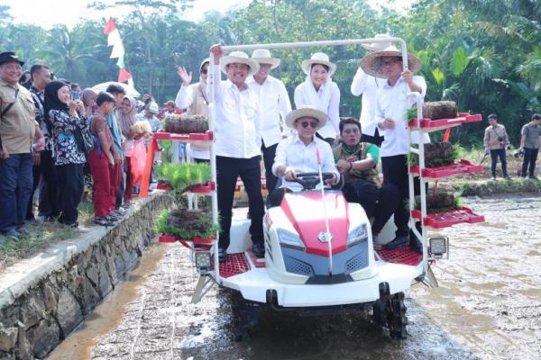 Menko Zulfliki Hasan didampingi para Menteri dan Wakil Menteri serta Gubernur Banten Andra Soni terpantau menaiki mesin traktor tanam padi mengelilingi areal sawah.