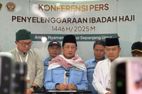 Menteri Agama (Menag) Nasaruddin Umar (tengah) memberikan keterangan pers terkait penyelenggaraan puncak haji di Armuzna (Foto: Kemenag)